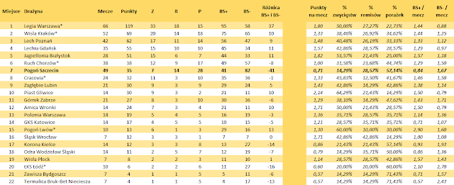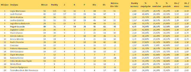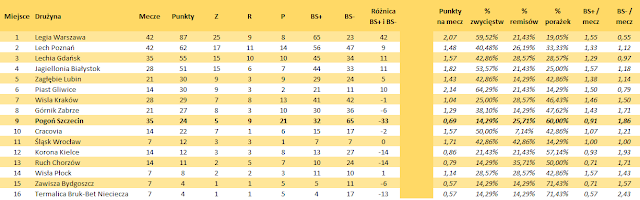 Dzięki bardzo dobrej postawie Piasta i Cracovii Pogoń spadła z 7 na 9 miejsce w ogólnej tabeli (prowadzi warszawska Legia). Jedynie stołeczna drużyna i Lech mają na swoim koncie więcej rozegranych meczów. W pozostałych kategoriach Portowcy są w ogonie stawki i wyprzedzają drużyny, które już pożegnały się z ekstraklasowymi rozgrywkami.