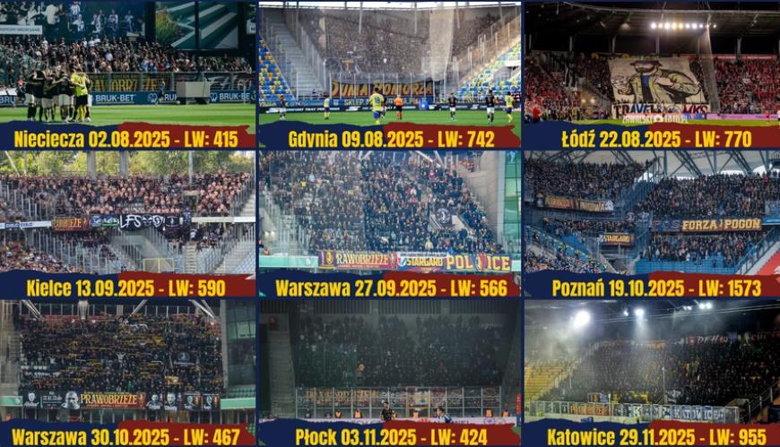W rundzie jesiennej sezonu 2025/2026 kibice Pogoni Szczecin odbyli 9 wyjazdów, pokonując łącznie kilka tysięcy kilometrów w poprzek Polski. Najliczniejszy wyjazd do Poznania oraz bardzo dobre liczby w Łodzi, Gdyni i Katowicach pokazują, że potencjał wyjazdowy Portowców stoi na niezwykle wysokim poziomie.