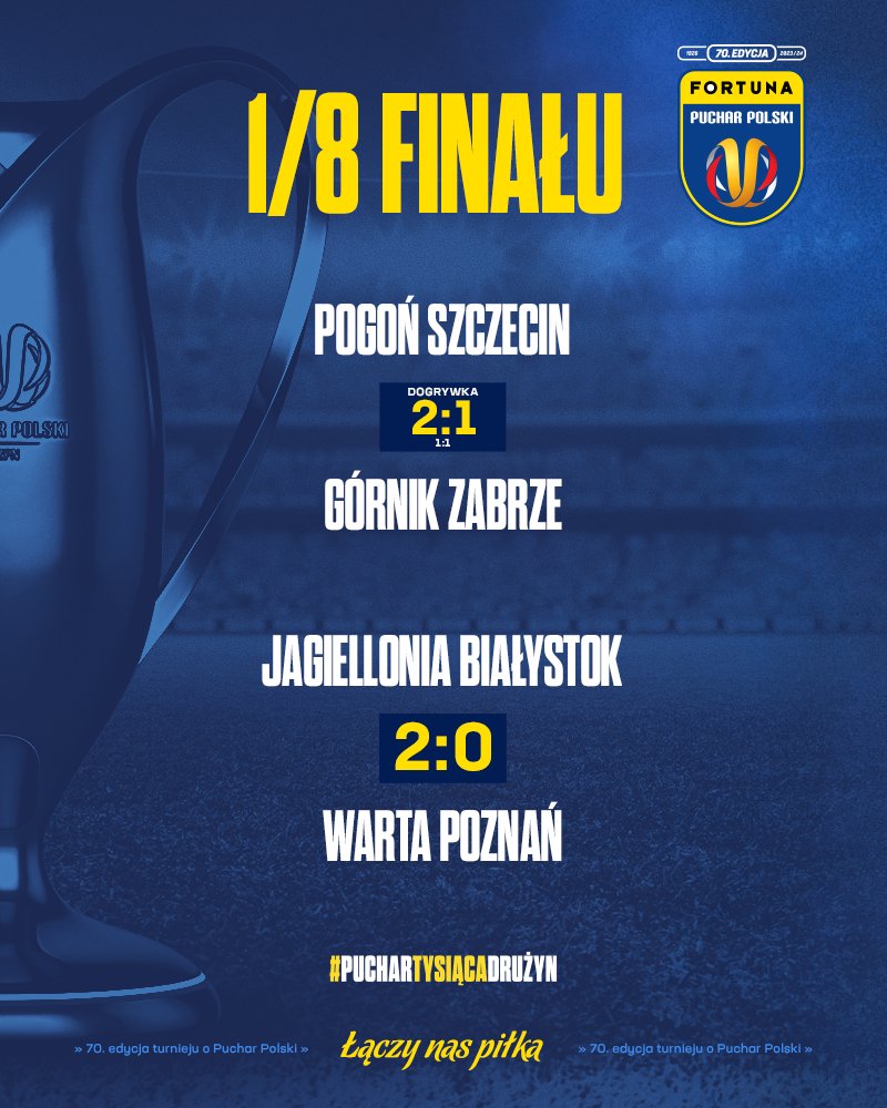 Pogoń Szczecin we wtorek po dogrywce pokonała Górnika Zabrze 2:1. Tego samego dnia odbył się jeszcze mecz Jagiellonii Białystok z Wartą Poznań. Lepsza była drużyna z Podlasia, która wygrała 2:0.