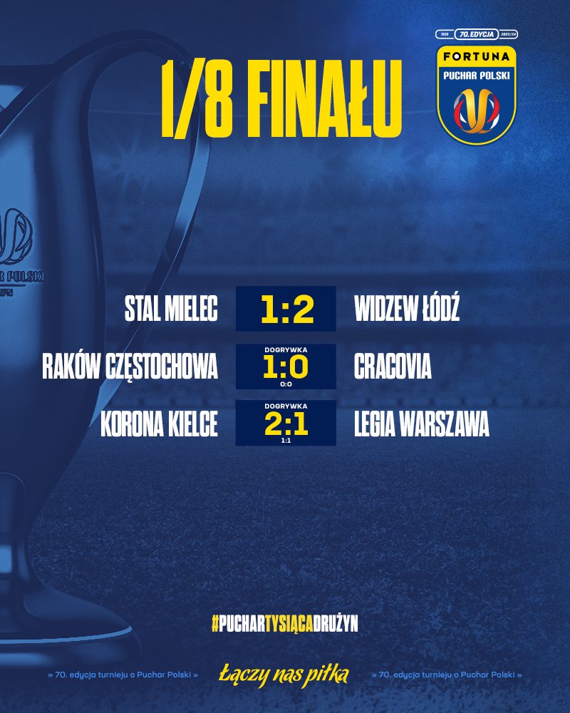 W środę zmagania w Pucharze Polski rozpoczęły się od meczu Stali Mielec z Widzewem Łódź. Lepsi okazali się podopieczni Daniela Myśliwca, którzy pokonali rywali na wyjeździe 2:1. W dwóch pozostałych środowych meczach do rozstrzygnięć potrzebne były dogrywki. Raków Częstochowa wygrał na własnym boisku z Cracovią 1:0, a Korona Kielce pokonała Legię Warszawa 2:1. Wygrana drużyny z Kielc to do tej pory największa i chyba jedyna niespodzianka w tej fazie rozgrywek.